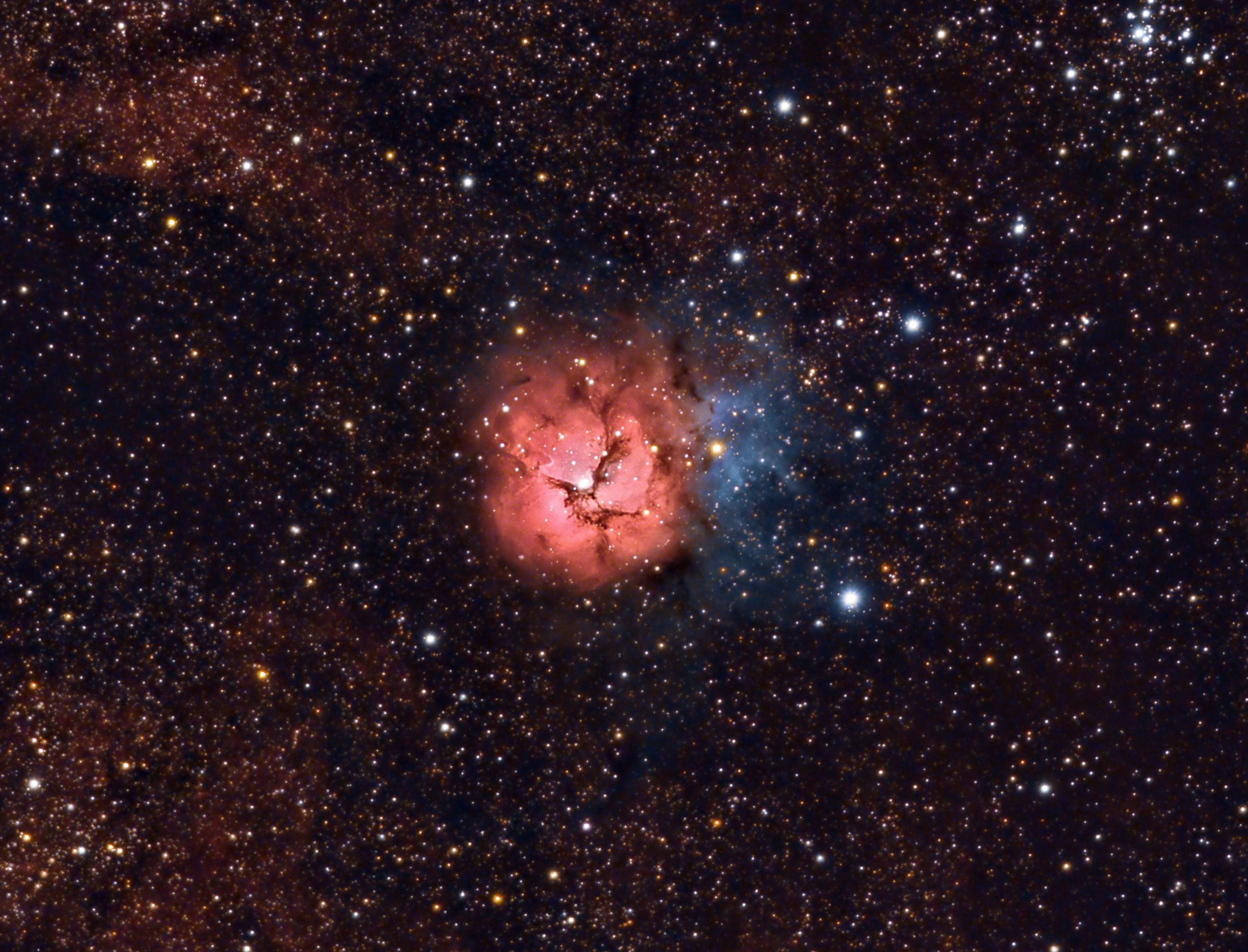 MESSIER 20 (Nebulosa Trífida). 18/07/2020. 30x300sg L b1 + 15x300sg Hα + 20x100sg RGB b2.