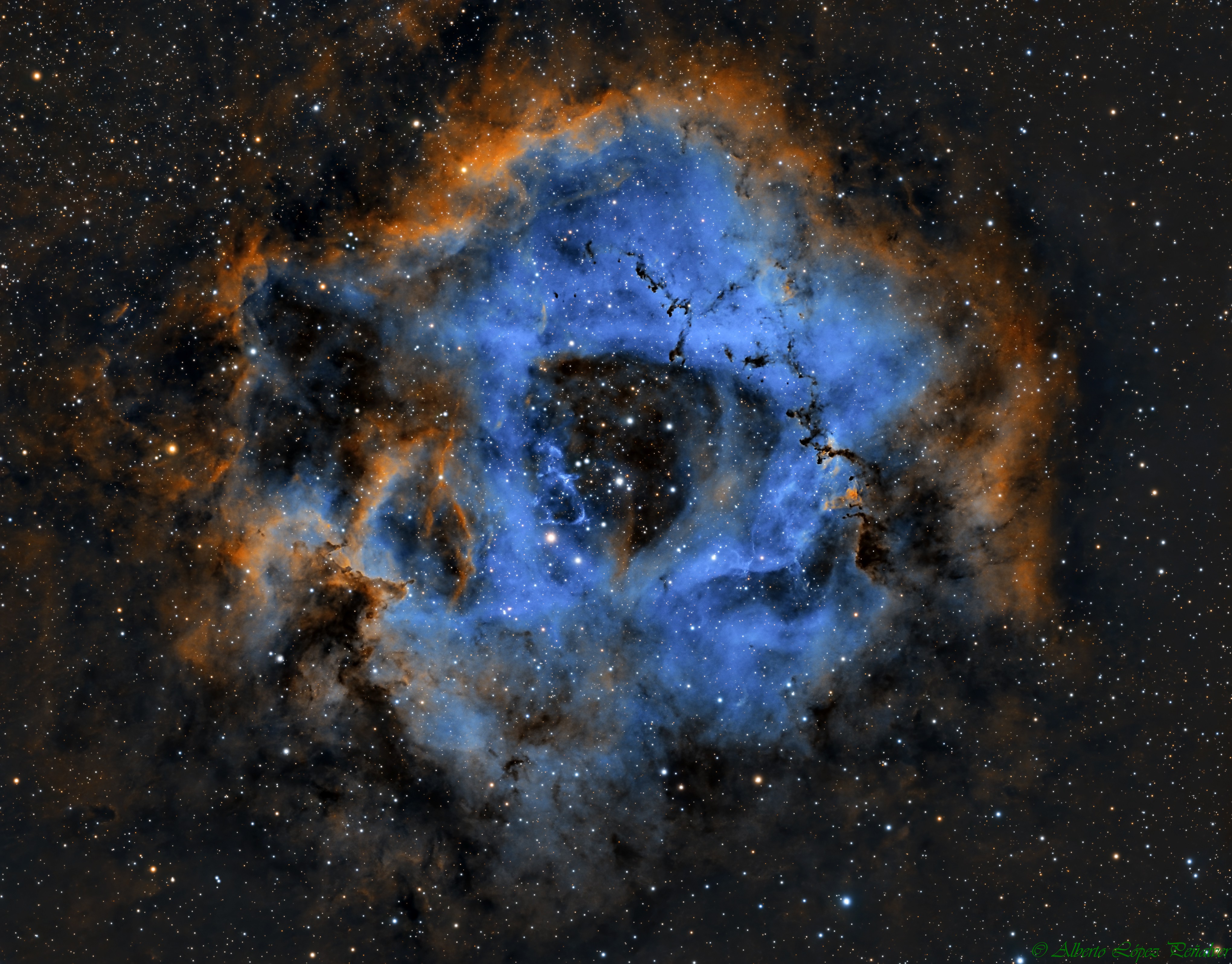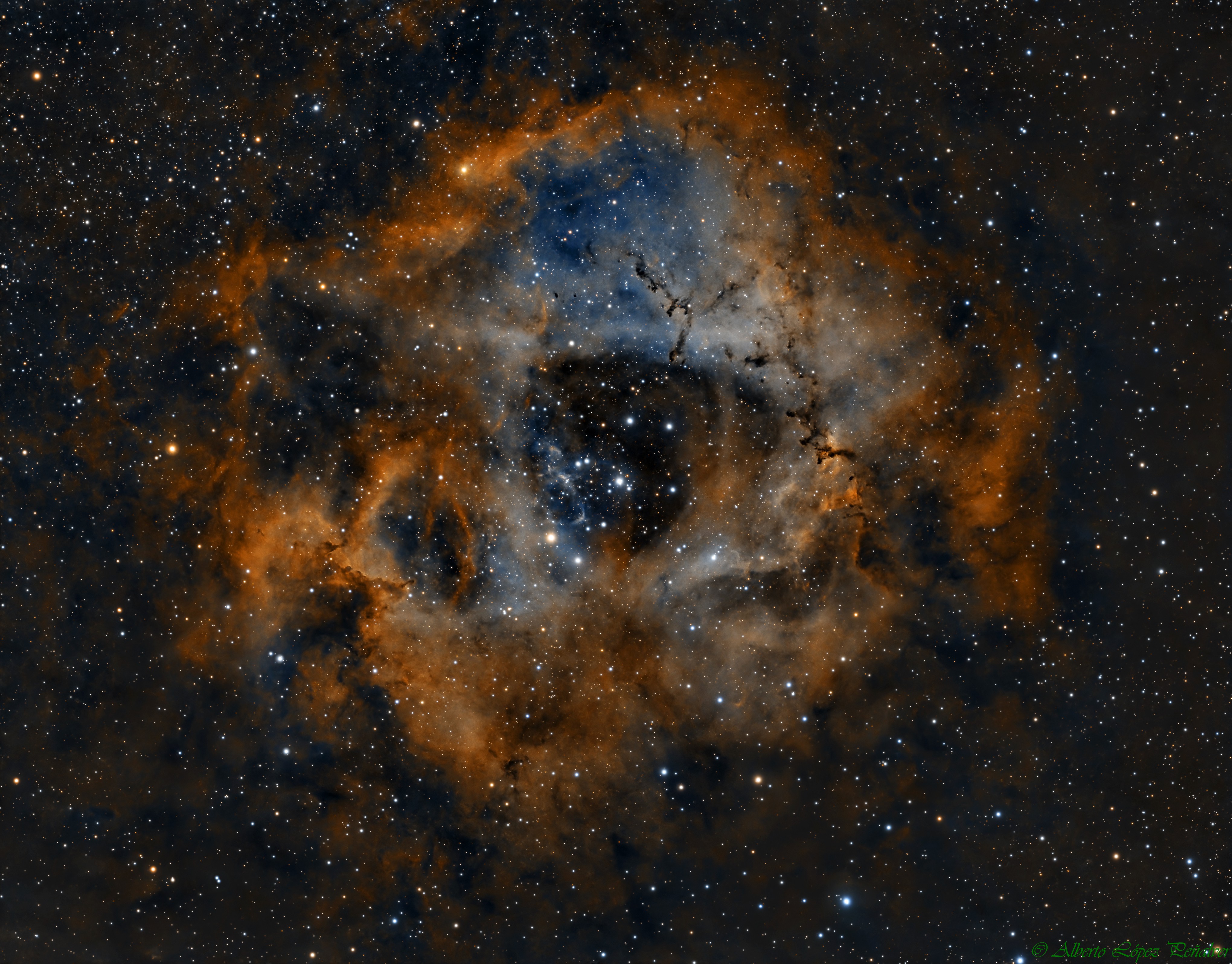 NGC-2244 ((Nebulosa del Rosetón). 01/03/2024. 20x600 sg Hα-OIII-SII (paleta natural).
